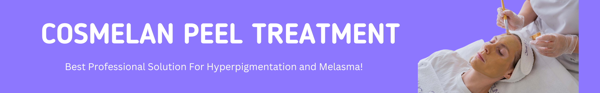 Cosmelan Peel is a kind of chemical peel, exclusively formulated to treat hyperpigmentation and melasma (the dark patches of skin on your face). It is a mixture of different ingredients, which work together to decrease the melanin, i.e., pigment production in your skin, and lighten the dark spots. Our treatment involves the application of Cosmelan Peel solution on your skin, which we leave on your skin for a certain period before neutralizing and removing it.Ā